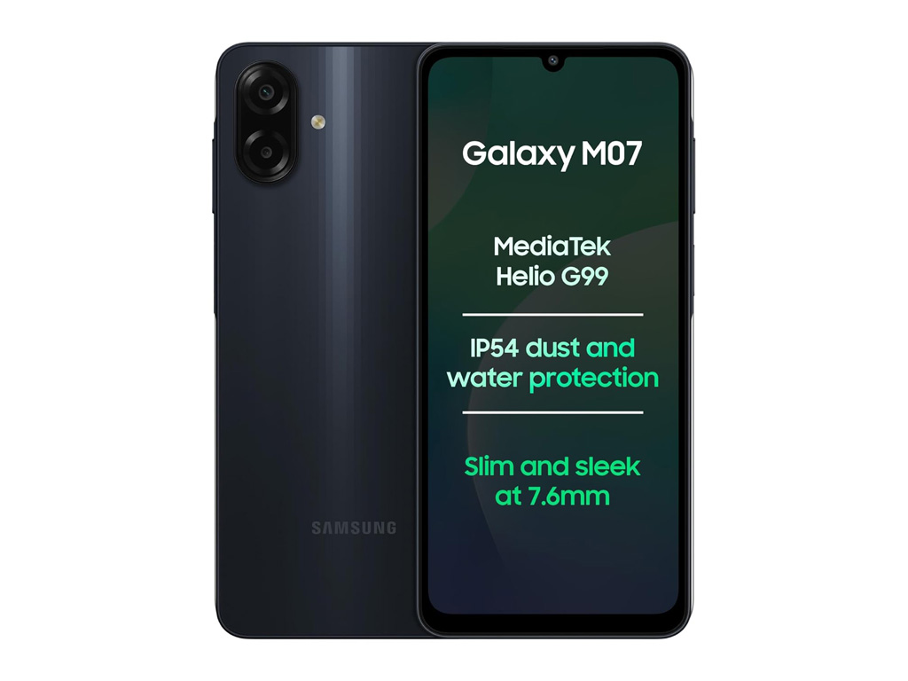 EN→TRThe Samsung Galaxy M07 was announced on October 1, 2025, and released the same day, aiming to offer a budget-friendly option with solid everyday performance. It comes in a sleek black color, weighing 184 grams and measuring 167.4 x 77.4 x 7.6 mm, making it comfortable to hold. The phone has a glass front with a plastic back and frame, and it carries an IP54 rating, which provides basic dust protection and splash resistance. The phone sports a 6.7-inch PLS LCD display with a 720 x 1600 pixels resolution and around 262 ppi density. While the resolution is modest, the 90Hz refresh rate ensures smooth scrolling and a decent visual experience for daily use. Peak brightness is enough for indoor and moderate outdoor use, though it may struggle under direct sunlight.