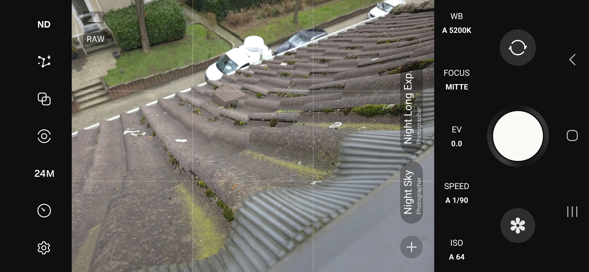 Ana kamera geçen yılki 200 MP'lik şirket içi sensörü kullanıyor. Bulanık noktalar S23 Ultra geçmişte kalmış gibi görünüyor, çünkü test cihazımızda hiçbirine rastlamadık. Galaxy S24 Ultra, piksel binning teknolojisi sayesinde 12 MP fotoğraflar üretiyor. Bunlar 50 MP olarak da oluşturulabilir, ancak bu yalnızca iyi aydınlatma koşullarında ve arkadan aydınlatma olmadan önerilir (karşılaştırmaya bakın). Pro modunda 24 MP de kullanılabilir. Genel olarak Samsung birçok mod ve ayar seçeneği sunuyor. Ek Expert RAW uygulaması, diğer şeylerin yanı sıra astrofotografi için kullanılabilir.