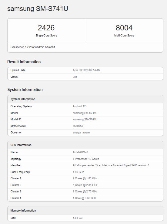Telefon "SM-S741U" model numarasıyla listeleniyor, 8 GB RAM'e sahip ve Android 17 adresinde çalışıyor. Performans açısından tek çekirdekte 2.426 ve çok çekirdekte 8.004 puan alıyor. Bu rakamların her ikisi de diğerinin performansından bir adım geride Galaxy S26 serisi telefonlar. Burada test edilen cihazdaki yonga setinin Exynos 2500değil Exynos 2600 bazı Galaxy S26 modellerinde.