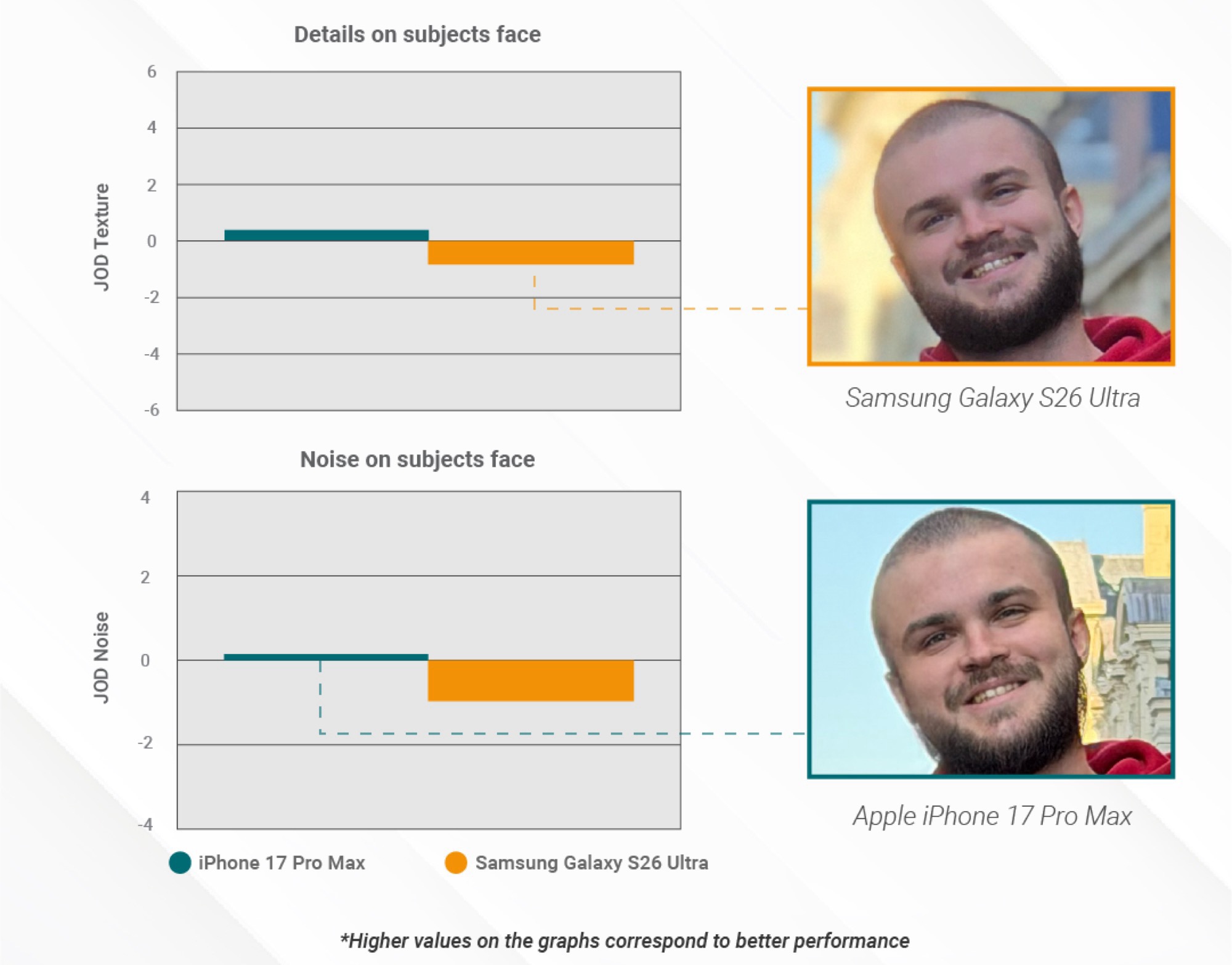 İkinci olarak, Galaxy S26 Ultra düşük ışıkta Galaxy S25 Ultra'ya göre çok daha doğru cilt tonları yakalıyor. Ancak DxOMark, Apple iPhone 17 Pro'nun ana kamerasının Galaxy S26 Ultra'nın geliştirilmiş ana kamerasından daha fazla ayrıntı kaydettiğini ve daha az görüntü gürültüsüne sahip olduğunu vurguluyor. DxOMark ayrıca otomatik odaklamanın yüzleri her zaman tam olarak yakalayamadığını ve bokeh simülasyonunun kusursuz çalışmadığını, bunun da görünür artefaktlara yol açtığını eleştiriyor