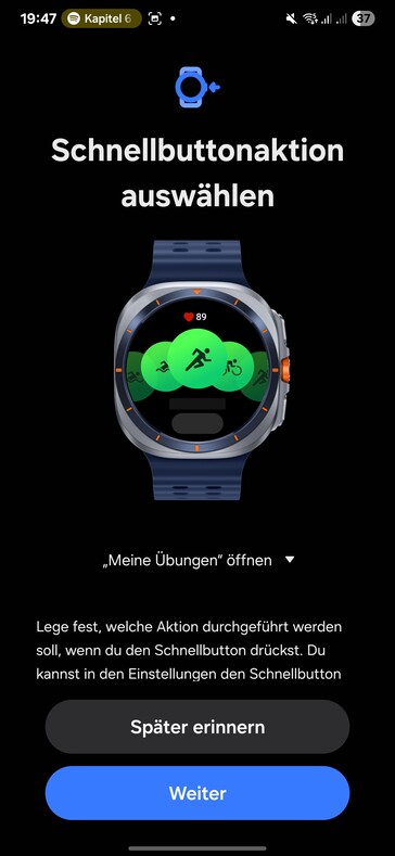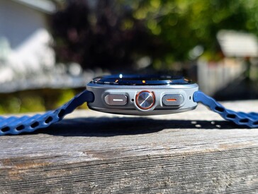Watch Ultra, Samsung'un akıllı saat serisindeki en büyük model. 47 milimetre genişliğiyle en geniş olanıdır - ve özellikle de İzle8önemli kalınlığı göze çarpmaktadır. Tıknaz görünüm, çift tokalı 24 mm kayışla daha da vurgulanıyor.