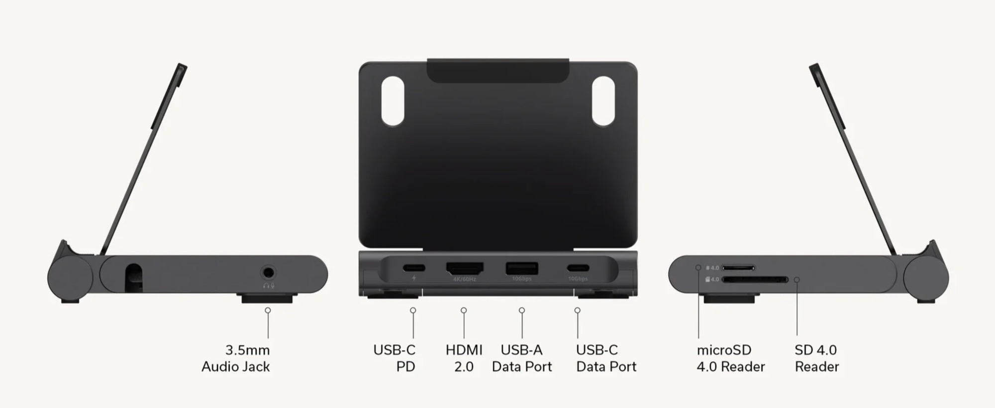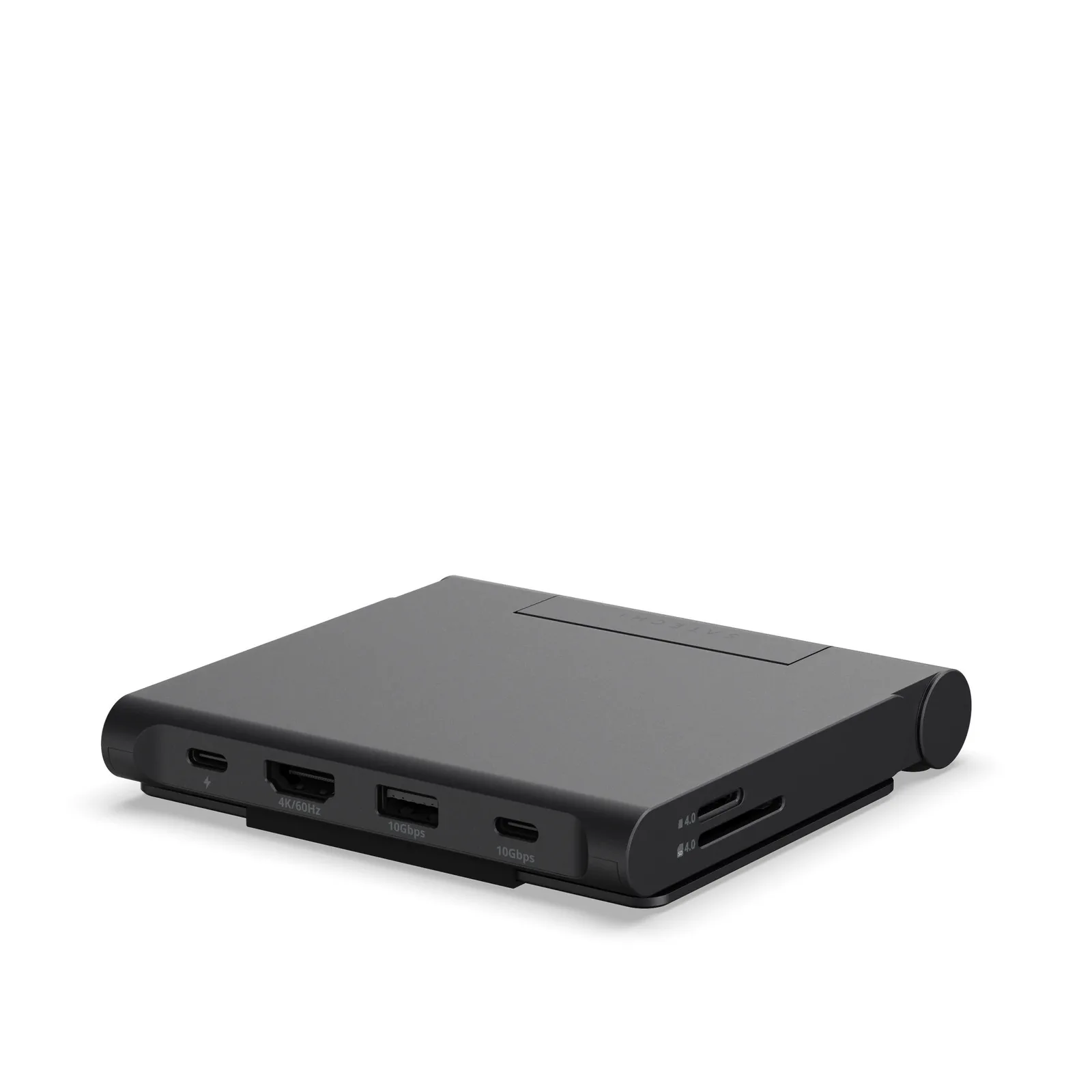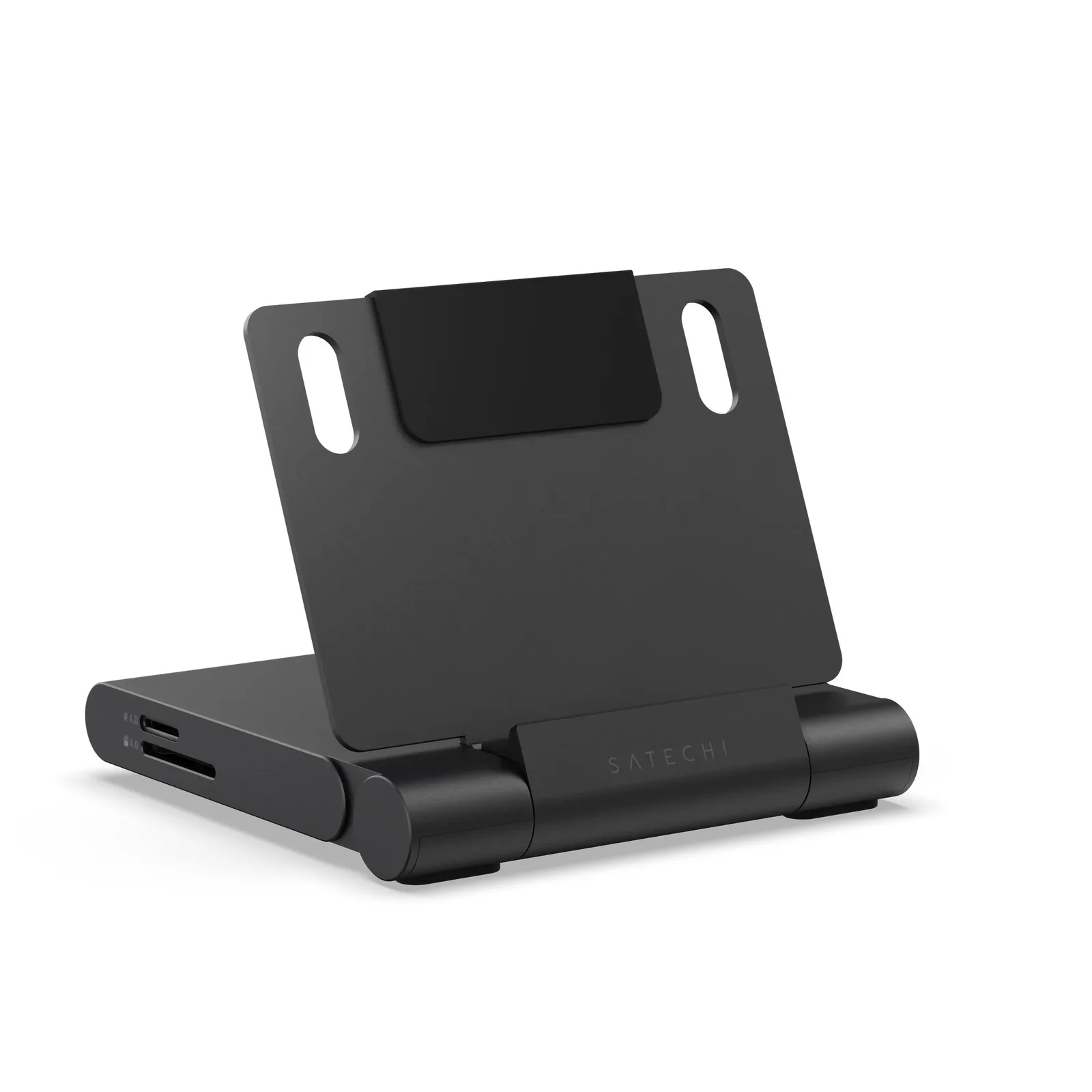 Satechi'nin entegre bir standa sahip en yeni bağlantı istasyonu, maksimum taşınabilirlik için tasarlanmıştır. Stand kolayca katlanarak hub'ın ceket cebinde veya sırt çantasında rahatça taşınmasını sağlar. Stand, bir akıllı telefonu veya tableti dik tutar ve bir klavye ve fare ile kullanıldığında, uyumlu tabletler dizüstü bilgisayar yerine rahatça kullanılabilir.