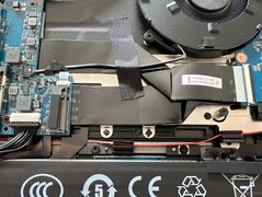 Şimdi Evo 15'in en önemli özelliklerinden biri olan bakım seçeneklerine geliyoruz. Alt kapağı çıkardıktan sonra (normal Phillips vidalarla tutturulmuş), fanlara ve vidalı bataryaya, ayrıca RAM için iki SO-DIMM yuvasına ve iki M.2 2280 SSD yuvasına erişebilirsiniz; bu nedenle yükseltmeler çocuk oyuncağıdır. Gerekirse WLAN modülü de değiştirilebilir.