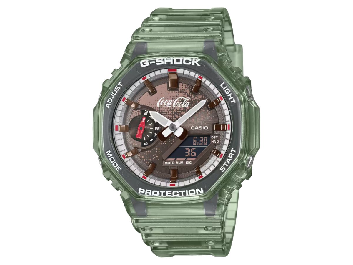 Sızdırılan görüntülerde görüldüğü üzere Casio G-Shock GA-2100CC-3A, cam Coca-Cola şişesinden esinlenen yarı saydam yeşil reçine gövde ve kayışa sahiptir. Bu kayış, içeceği taklit eden kabarcık desenli kahverengi bir kadranı ve Coca-Cola markasına uygun kırmızı vurguları çevreliyor. Ayrıca, standart haftanın günü gösterge ibresi yerine bir şişe bulunuyor.