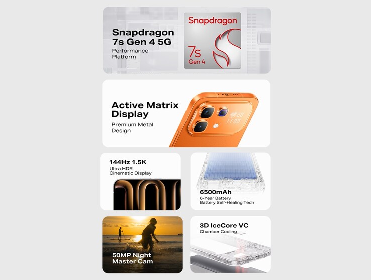Çerçeve üzerinde, iPhone 17'deki dokunmaya duyarlı Yakalama Düğmesini güçlü bir şekilde anımsatan bir kamera deklanşör düğmesi görülüyor, ancak işlevselliği ile ilgili ayrıntılar henüz bilinmiyor. Infinix Note 60 Pro, gücünü Qualcomm Snapdragon 7s Gen 4dört ARM Cortex-A720 performans çekirdeği ve dört Cortex-A520 verimlilik çekirdeği bulunuyor.