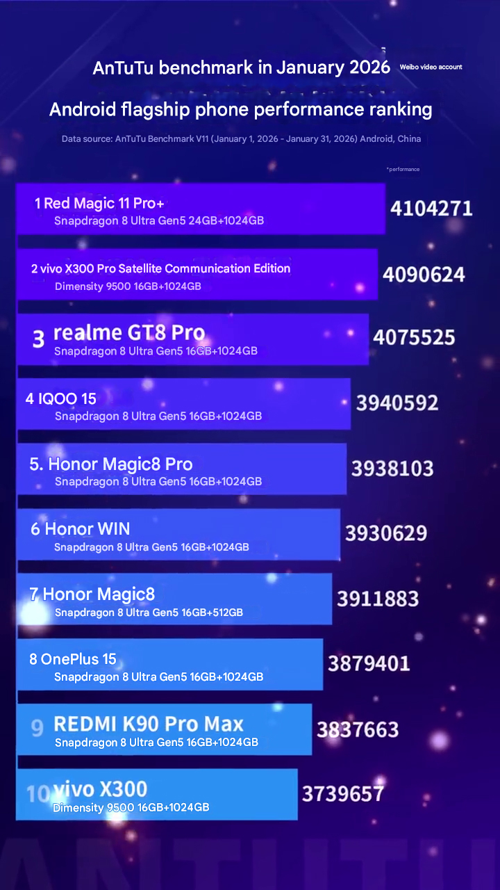 - Snapdragon 8 Elite Gen 5 destekli RedMagic 11 Pro+ ortalama 4,104,271 puanla ilk sırayı aldı.