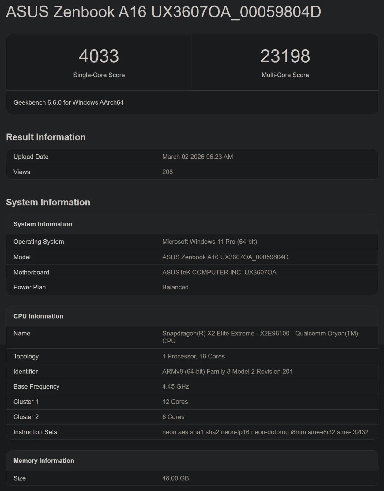 Snapdragon X2 Elite Extreme X2E-96-100 CPU ve GPU performansı, Asus dizüstü bilgisayarla birlikte Geekbench'te ilk kez etkileyici