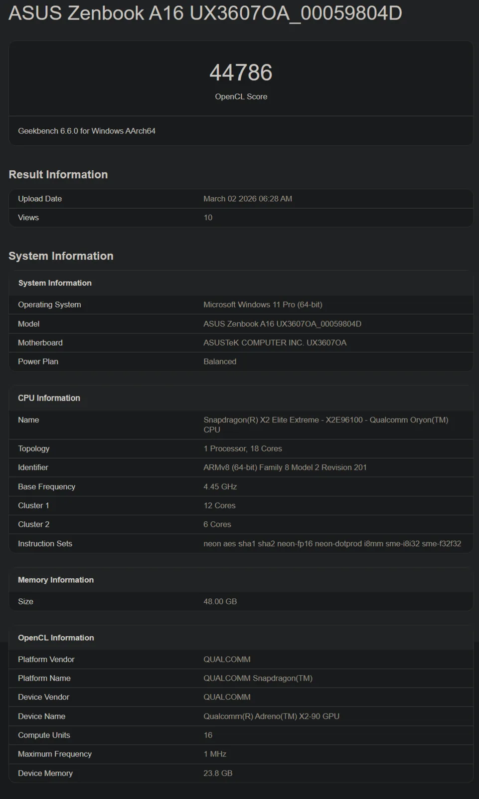 İkinci bir liste bize Snapdragon X2 Elite Extreme X2E-96-100'ün GPU performansına bir bakış sunuyor. Adreno X2-90 GPU, Geekbench'in OpenCL kıyaslamasında 44.786 puan alıyor. Geekbench 16 CU'ya sahip olduğunu söylüyor, ancak bildirilen saat hızı sadece 1 MHz olduğu için skora güvenilemez. Yine de, son neslin neredeyse iki katı performans sunmayı başarıyor Adreno X1-85 GPU, aynı kıyaslamada sadece 23.854 puan alıyor.