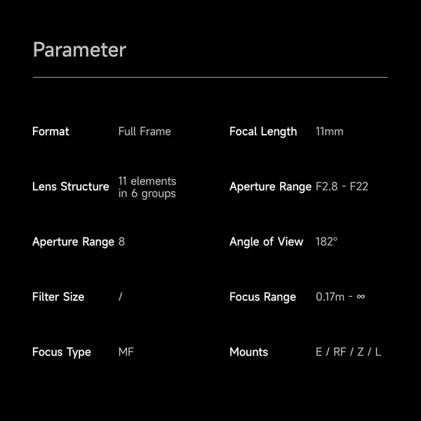 Brightin Star'ın en yeni full frame lensi 11 mm odak uzaklığı ile son derece geniş açılıdır ve 182 derecelik bir görüş açısı sağlar. Balıkgözü lenslerde olduğu gibi, çizgiler görüntünün kenarına yaklaştıkça daha fazla bozulur ve ilgili yazılım gerektiğinde görüntüleri düzeltebilir.