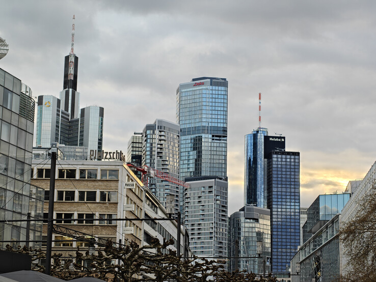 Şimdi her iki akıllı telefon için de zorlu bir görev başlıyor: Gün ışığının azalmasıyla birlikte, bulunduğumuz yerden yaklaşık 800 metre uzaklıktaki Westendstraße 1 yüksek binasını ve Messeturm'u yakınlaştırıyoruz.