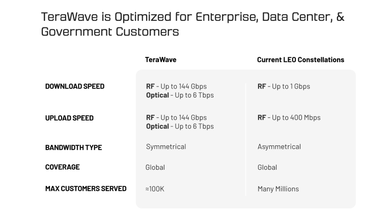 Jeff Bezos'un Blue Origin'i duyurdu TeraWave, saniyede 6 terabayta kadar simetrik bant genişliği sunmak üzere tasarlanmış ve doğrudan kurumsal, veri merkezi ve devlet müşterilerini hedefleyen bir uydu internet ağıdır. Aksine Starlinkmilyonlarca bireysel kullanıcıya hizmet veren TeraWave, çok daha küçük bir müşteri tabanını hedeflemektedir.