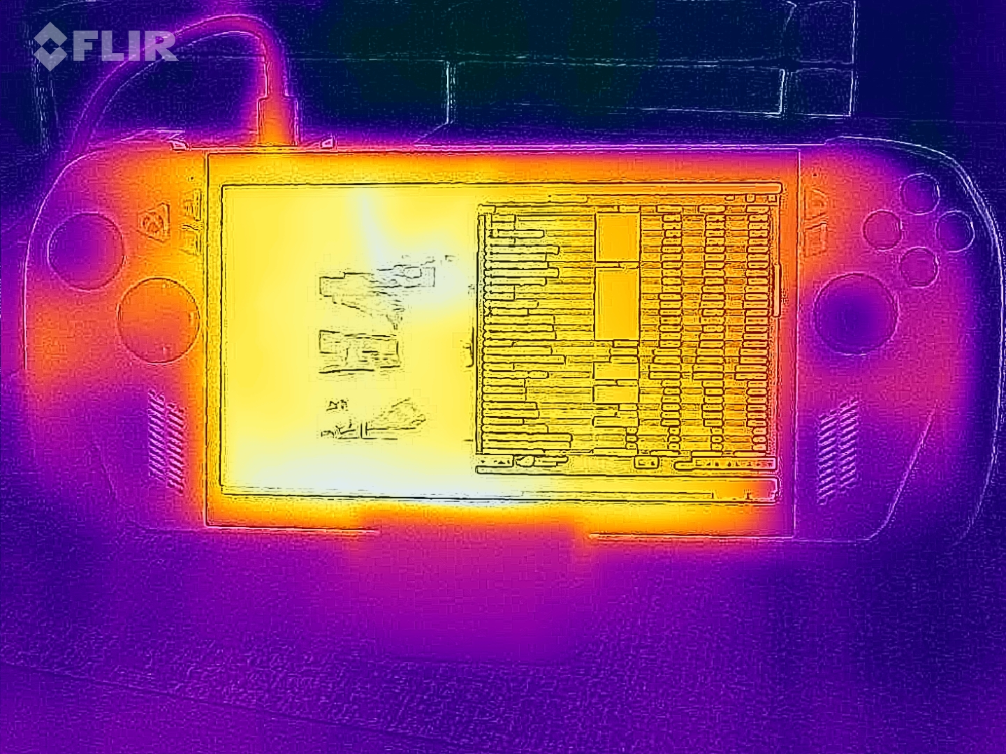 (±) 3: The average temperature for the upper side is 37.7 °C / 100 F, compared to the average of 32.1 °C / 90 F for the class Handheld / UMPC.
