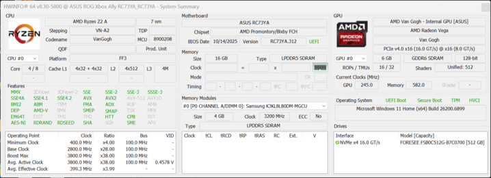 Ryzen Z2 A, eski Zen 2 mimarisini temel alır ve Xbox Ally'de 16 GB RAM ile eşleştirilmiştir. Test cihazımızda, bu belleğin 6 GB'ı varsayılan olarak entegre RDNA 2 GPU'ya atanmıştır, ancak bu Armoury Crate SE yazılımında ayarlanabilir.