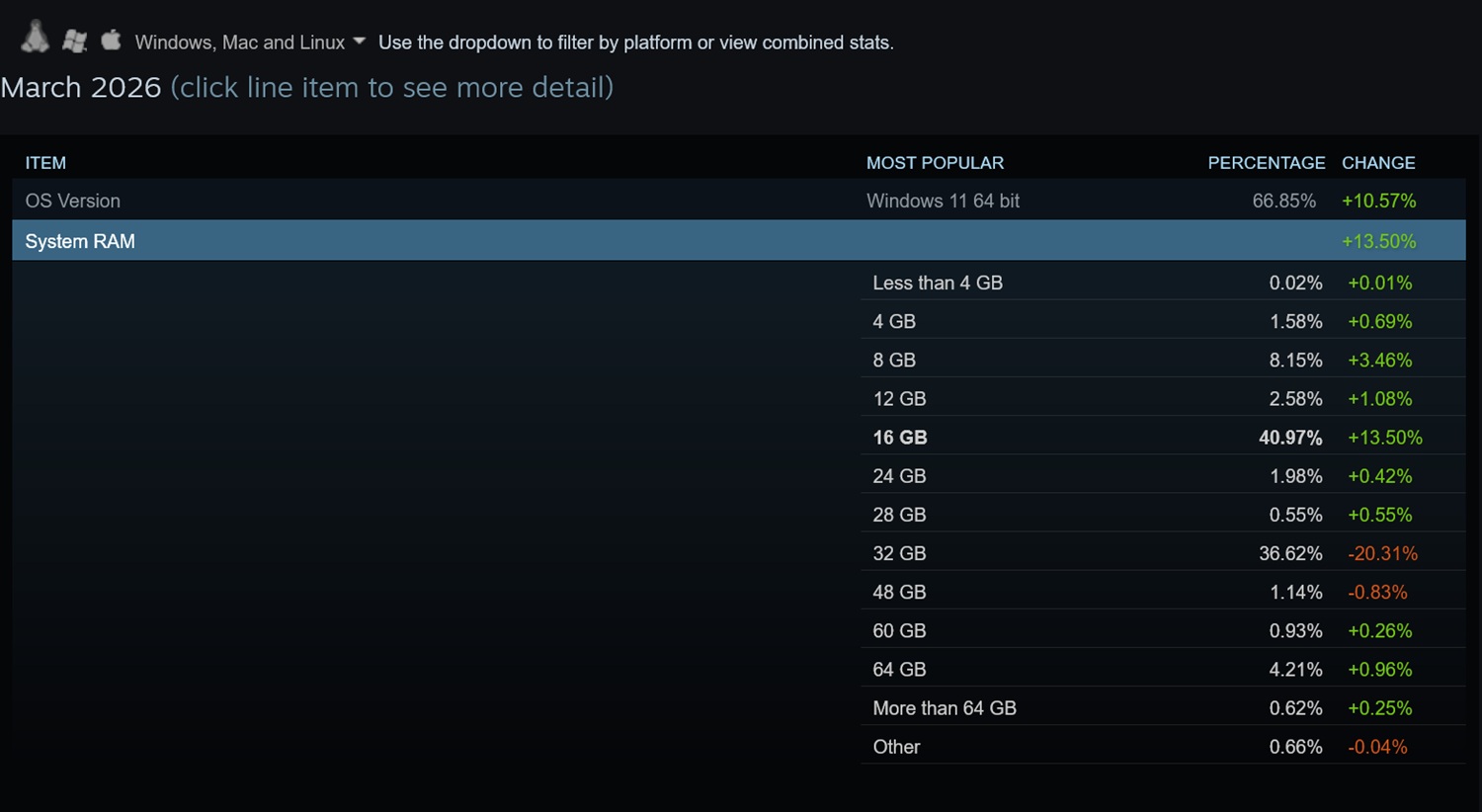 Valve, her ay müşterileri arasında en popüler donanım konfigürasyonlarını açıklıyor şaşırtıcı sayıda oyuncu. En belirgin değişikliklerden biri Sistem RAM'i kategorisinde görülüyor. 32 GB kapasiteler bir önceki rapora kıyasla %20,31'lik kayda değer bir düşüş yaşadı. Bu arada, 16 GB değerinde modüllere sahip PC'ler popülerlikte %13,50'lik bir artış yaşadı.