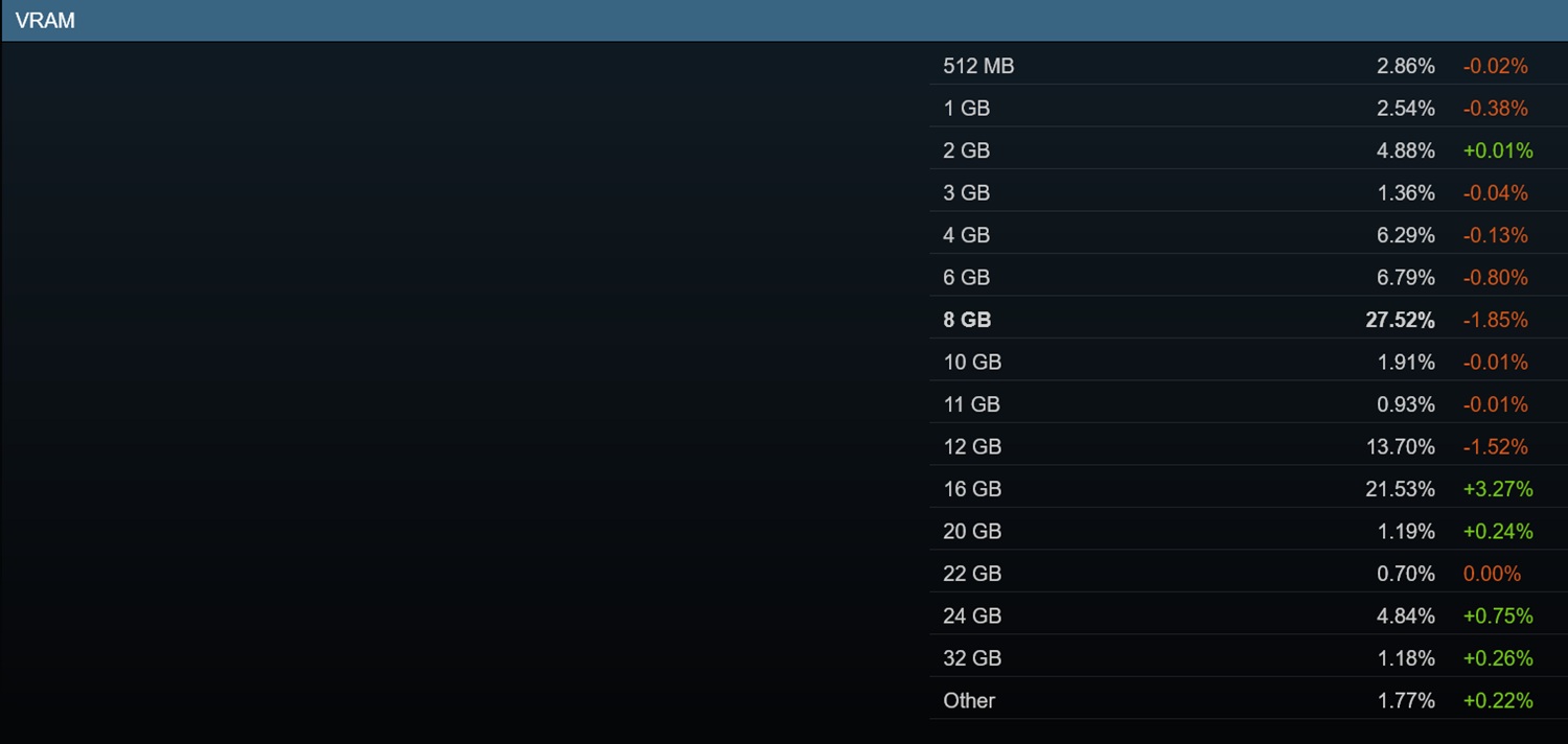 Uzatılmış bileşen kaynağı diğer donanımları aynı şekilde etkilemiyor. 16 GB'lık grafik kartları VRAM 3,27 oranında artarak toplam paylarını %21,53'e çıkardı. 8 GB VRAM kullanan GPU'lar daha yaygın olmaya devam ediyor, ancak %1,85 oranında düşüş gösterdi. Bellek kıtlığı, daha yüksek kapasite sunan hedefleri daha maliyetli hale getirdi. Yine de alıcılar bu parçaları yükseltme konusunda sistem RAM'ine kıyasla daha az esnekliğe sahip.