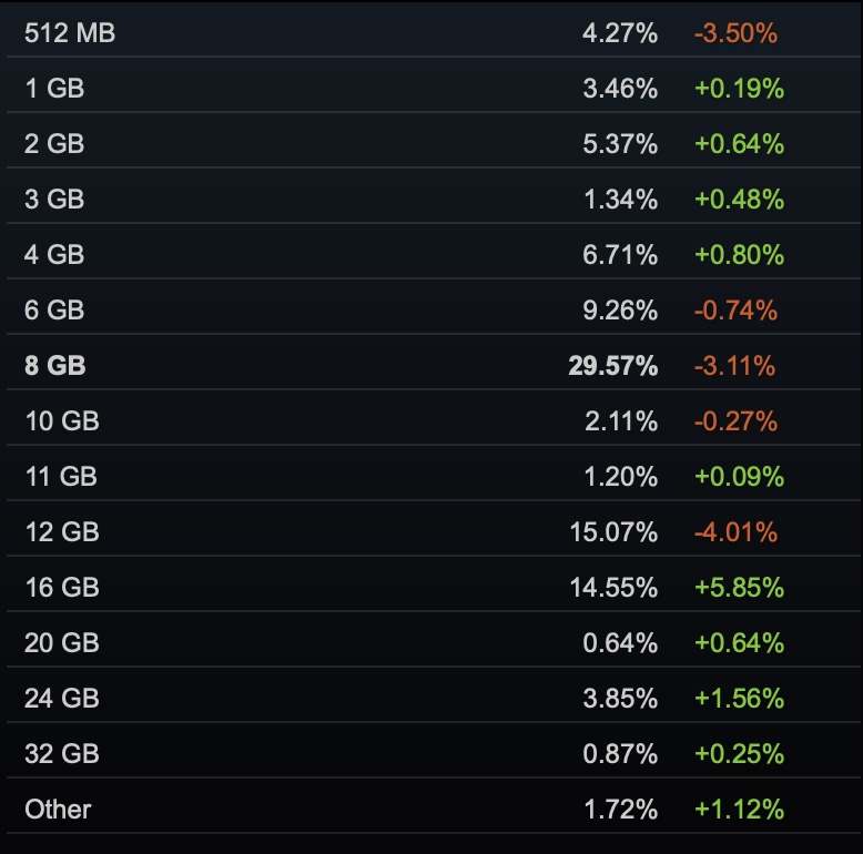 Örneğin, Ocak 2026 sonuçlar, oyun donanımlarının %29,57'sinin 8 GB VRAM ile donatıldığını gösterdi ki bu oldukça büyük bir rakam gibi görünüyor. Ne yazık ki Steam, hataların bildirilen verileri ne ölçüde etkilemiş olabileceğini açıklamadı.