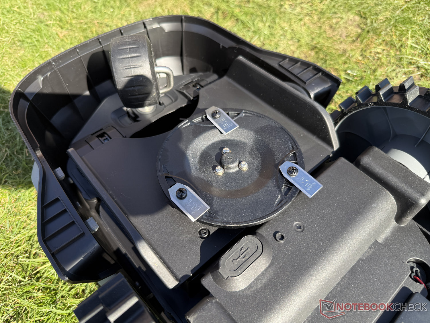 Ancak, alt tarafa bakıldığında durumun böyle olmadığı görülür. Biçme diskinin bulunduğu yer burasıdır, ancak 16 cm'lik biçme genişliği ile oldukça kompakttır. Kesme yüksekliği 20 ila 50 mm arasında ayarlanabilir, ancak fiyat aralığına uygun olarak yalnızca manuel olarak ayarlanabilir. Kontrol ünitesine ek olarak, navigasyon için öne bakan kamera da üst kısımda yer alıyor ve bunu aşağıda tartışacağız.
