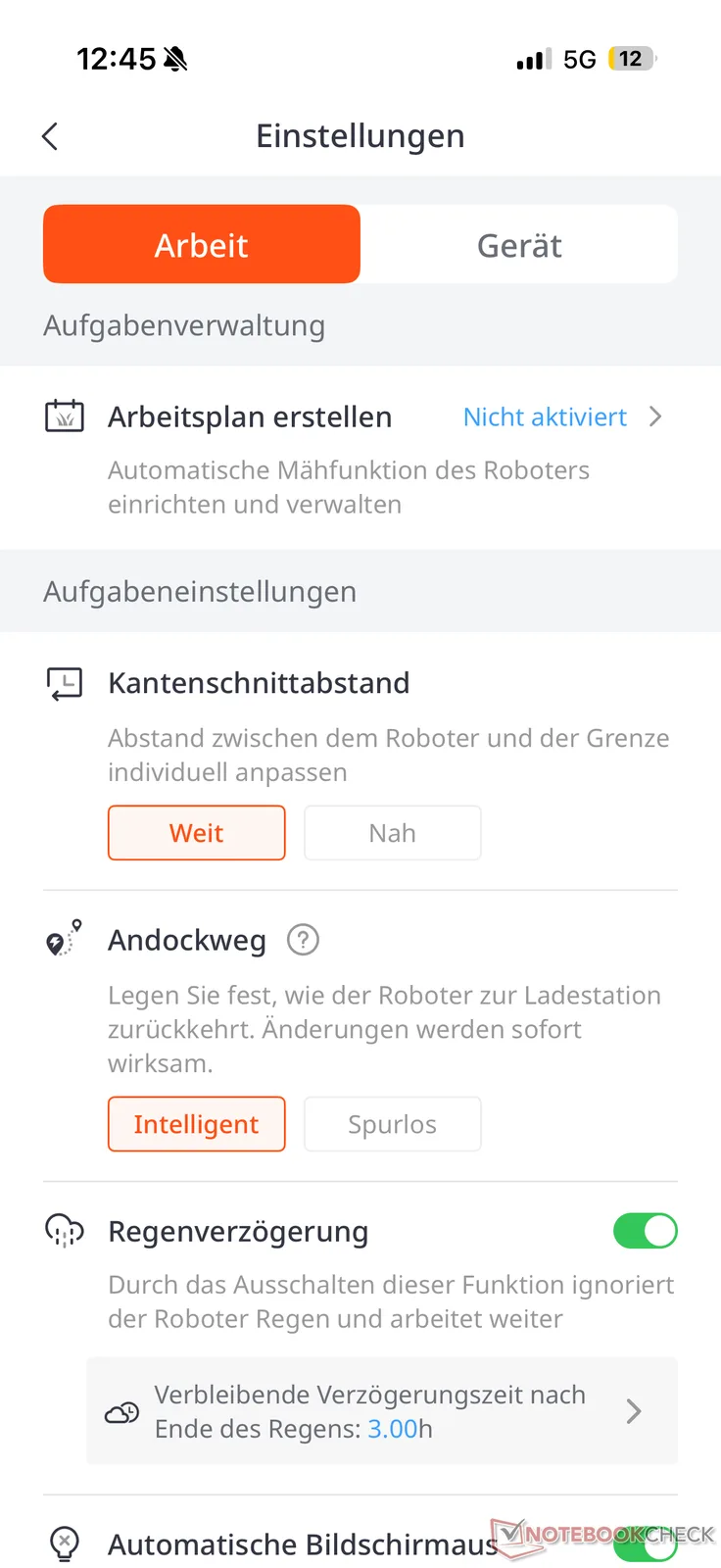 Çim kenarına olan mesafe uygulamada "Uzak" ve "Yakın" arasında ayarlanabilir. Pratik deneyimlerimize göre, sert kenarlı eşit geçişler için yaklaşık 5 ila 10 cm'dir. Çim ile örneğin kenarları olmayan yataklar arasındaki geçiş pürüzsüzse, mesafe daha da fazla olabilir. Her durumda (diğer birçok robotik çim biçme makinesinde olduğu gibi), özellikle biçme diski ile makinenin kenarı arasındaki mesafe ek 8 cm olduğundan, bu ara sıra manuel olarak yeniden çalışmayı gerektirir.