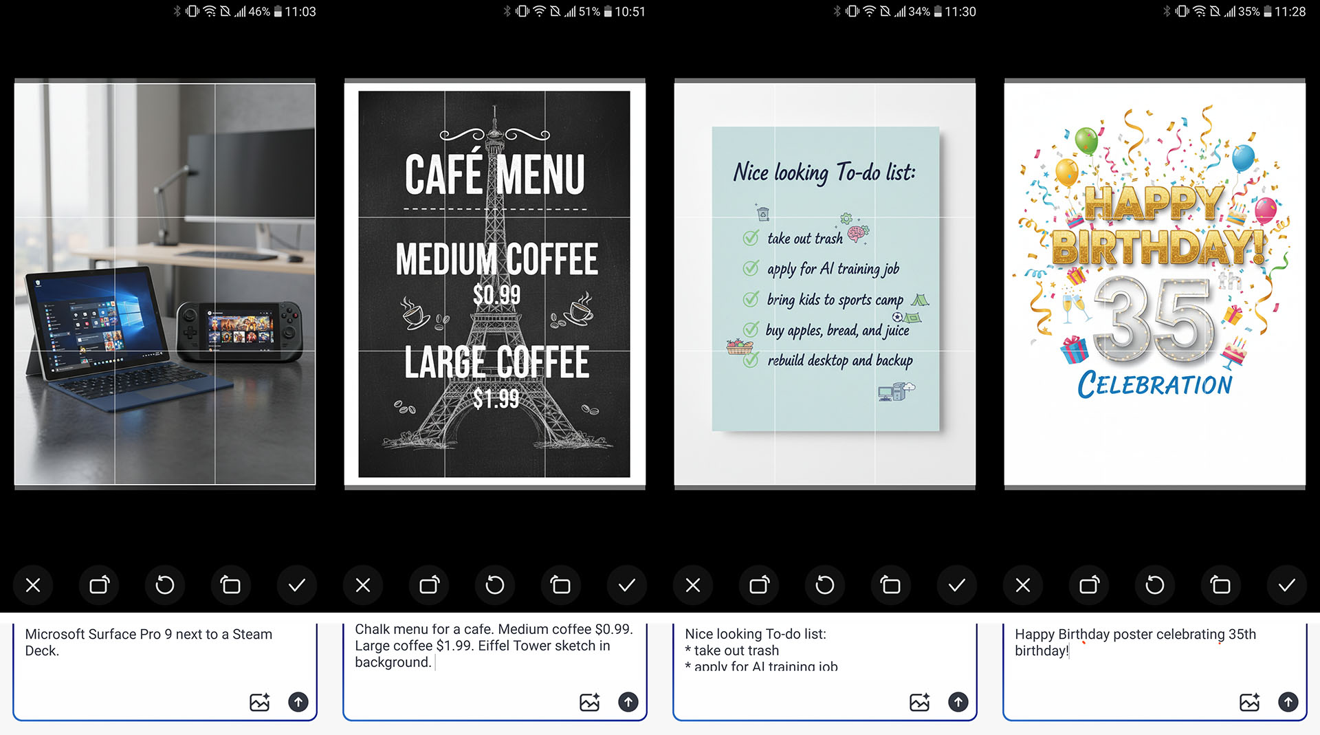 Yapay zeka, gerçeklere uygun metin, harita ve takvim oluşturmada zayıf, yapılacaklar listesi ve menüler oluştururken oldukça güvenilir, tanınmış figürler oluştururken zaman zaman güvenilmez ve karikatür benzeri sanat, rahatlatıcı doğa sahneleri veya sevimli golden retriever kalabalığı oluşturmada oldukça iyi. İstenen resim oluşturma sırasında, nehirde giden bir tren veya gösterilen yanlış bir nesne gibi halüsinasyonlar meydana gelebilir.