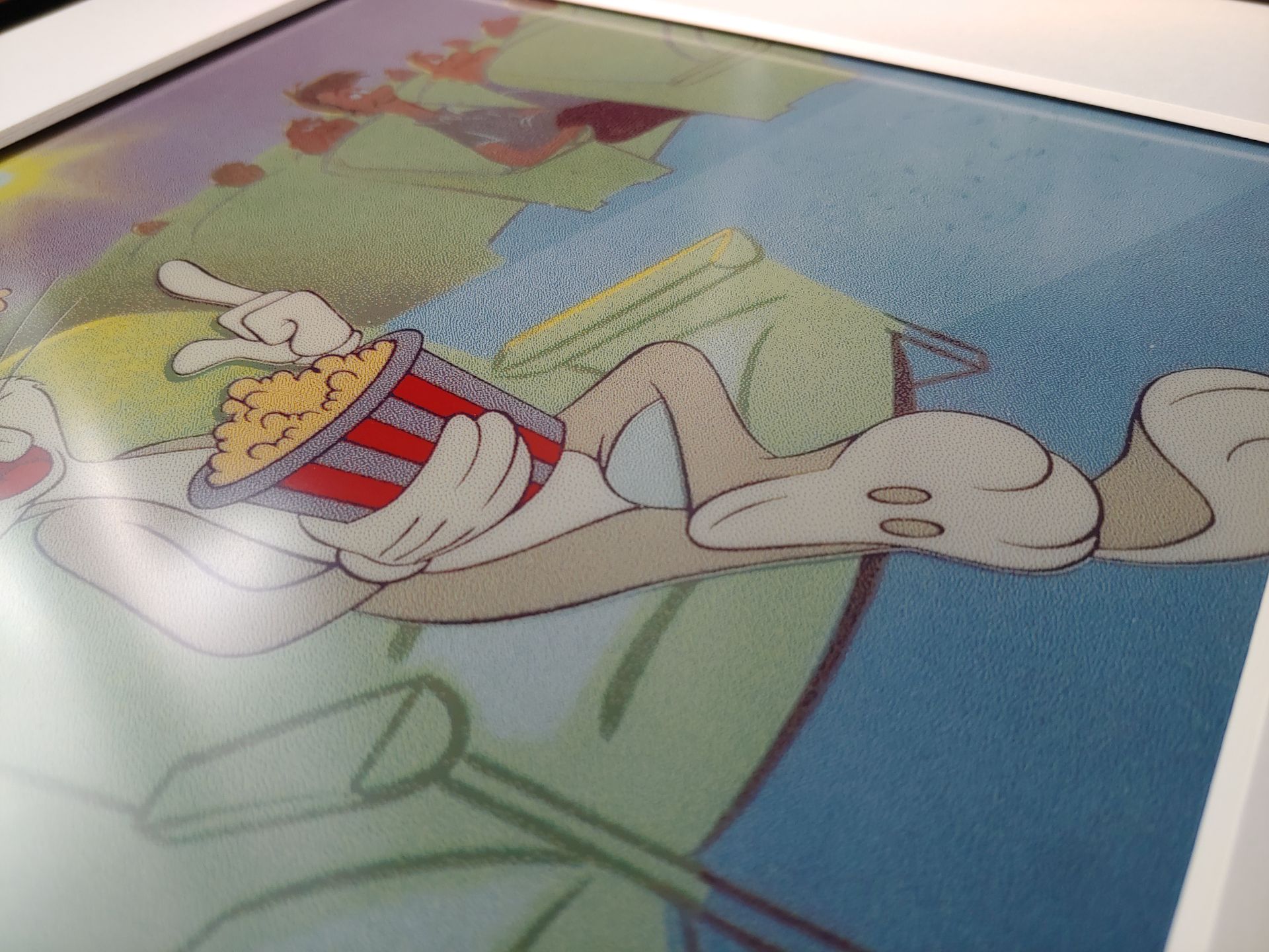 Sınırlı mavi gam, gerçek çizgi film cel sanatıyla yan yana karşılaştırıldığında görülebilir.