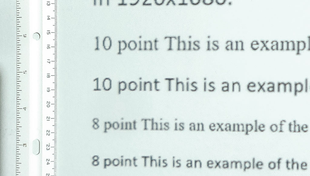 Bir bilgisayara bağlandığında, dört noktalı metin ve daha büyükleri okunabilir, böylece TCL C1 harici bir PC ekranı olarak kullanılabilir. Yansıtılan görüntüye 1 m (3,3 ft.) veya daha yakın mesafeden yaklaşıldığında pikseller görünür hale gelir, ancak normal izleme mesafelerinde genellikle fark edilmez. Pikselleşme, altı puntonun altındaki küçük metinlerde rahatsız edici hale gelir. Gri rampalar tamamen pürüzsüz değildir, ancak görünür renk bantları genellikle koyu gölgeler ve düz renk alanlarıyla sınırlıdır.
