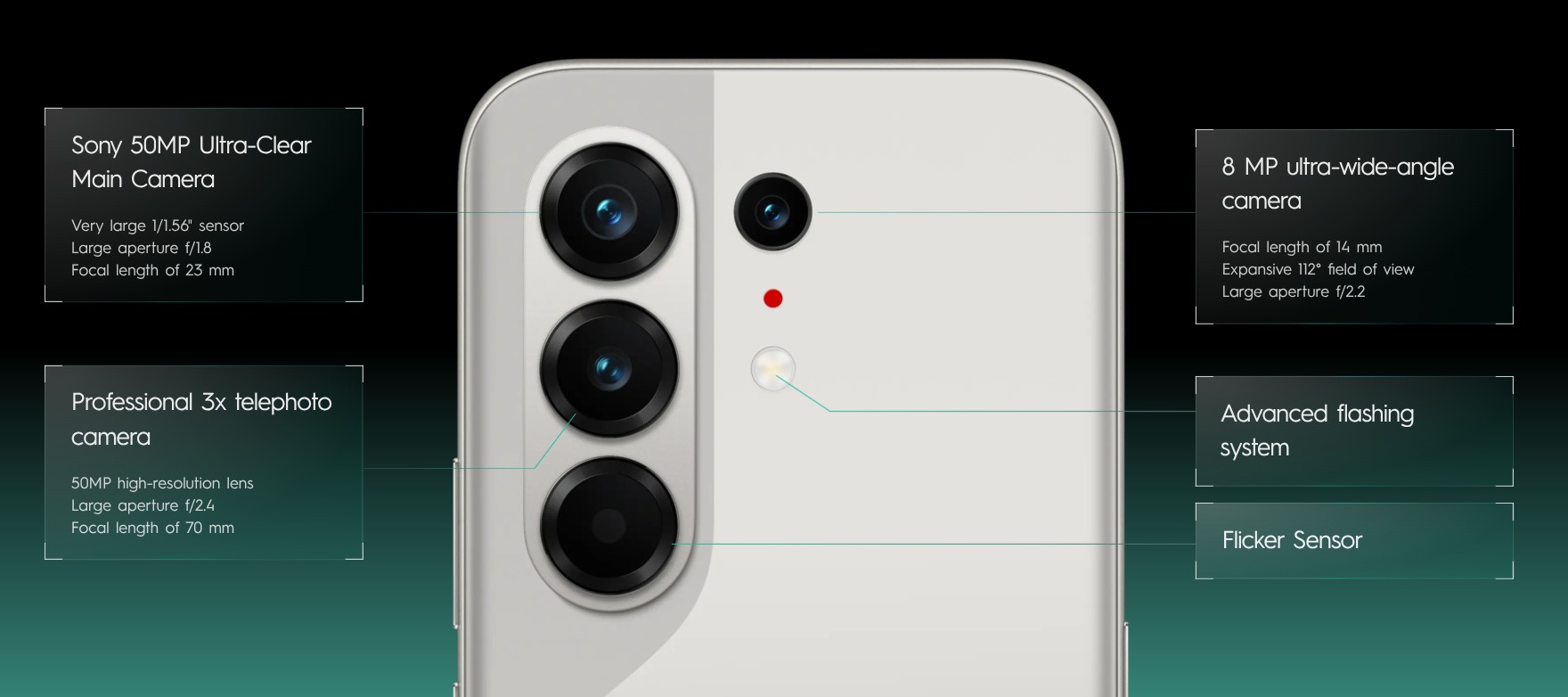 AI 60x superzoom modu (yalnızca pro model), canlı fotoğraf modu ve hatta kullanıcıların 2 metreye kadar derinlikte video kaydetmelerine olanak tanıyan bir su modu gibi çeşitli kamera özellikleri vardır. Telefon ayrıca parlama önleyici, parlama giderici, gölge giderici ve statik görüntüleri 3D'ye dönüştüren bir özellik de dahil olmak üzere AI fotoğraf düzenleme özellikleriyle birlikte geliyor.