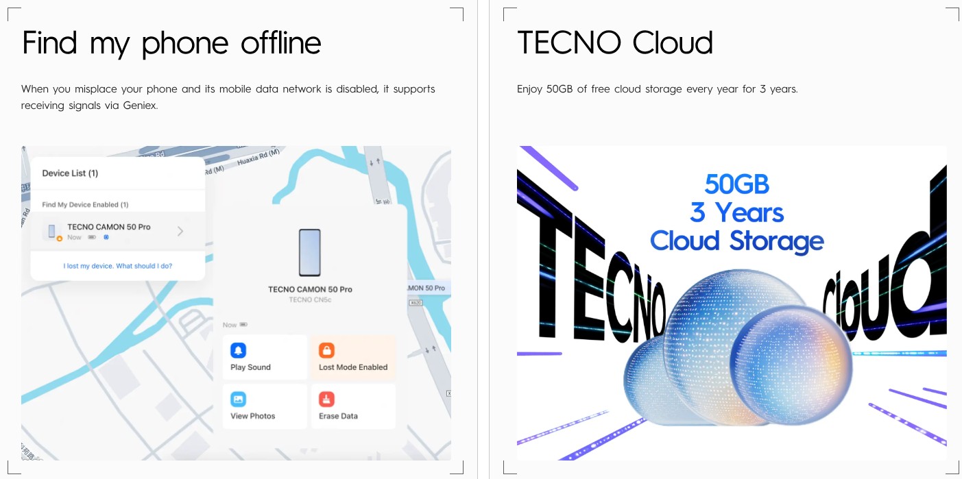 Telefonlar, çeşitli AI özellikleri getiren HiOS 16 ile birlikte geliyor, ancak iPhone'lar için tek dokunuşla aktarım özelliği, çevrimdışı telefonumu bulma desteği ve 3 yıl boyunca ücretsiz 50 GB bulut depolama alanı gibi oldukça kullanışlı başka eklemeler de var. Tecno, iki telefonun 3 işletim sistemi yükseltmesi ve 5 yıllık güvenlik güncellemeleri alacağını söylüyor. Ayrıca kullanıcılara, telefonların 5 yıllık kullanımdan sonra da ilk günkü gibi akıcı kalacağı konusunda güvence veriyor.