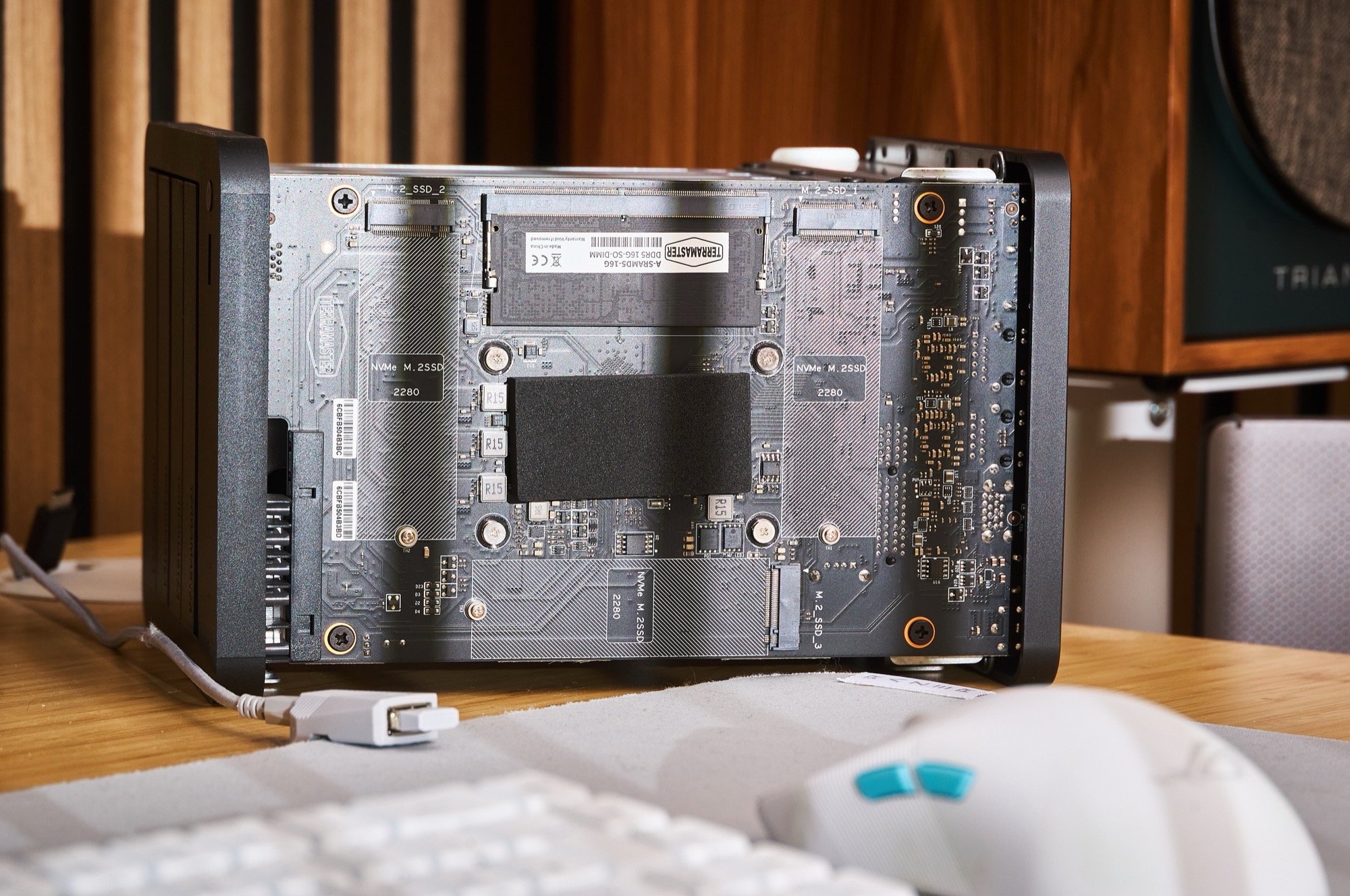 HDD'ler ve SSD'ler, farklı hızları göz önüne alındığında mantıklı olan iki ayrı depolama havuzu oluşturur. Her SSD, PCIe 3.0 x1 üzerinden bağlanır ve okuma ve yazma hızlarını yaklaşık 1 GB/s ile sınırlar. Giriş seviyesi SSD'ler bile bu bağlantıyı doyurabilir ve NAS, iki 5 Gbps LAN bağlantı noktası üzerinden yaklaşık 1,25 GB/s ile sınırlandırıldığından, mütevazı PCIe bant genişliği gerçek dünya kullanımında anlamlı bir dezavantaj değildir.