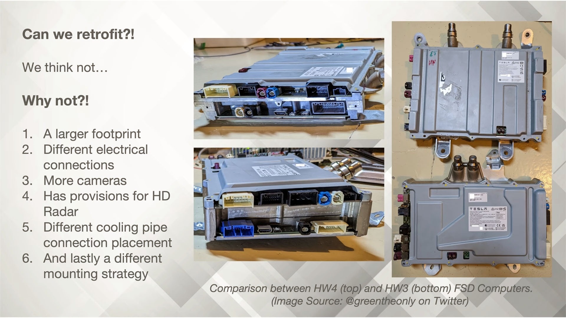 Musk, HW3'ün"FSD'yi denetimsiz olarakgerçekleştirme kapasitesine sahip olmadığını" söyledi ve HW3'ün eskimiş olmasının arkasındaki suçlu olarak bellek bant genişliğini gösterdi. Bu, yazılım güncellemesinin mevcut donanımlarında tam otonom rüyasının kilidini açacağına dair yıllarca güvence veren bir şirketten dikkat çekici bir açıklama; Ekim 2025 gibi yakın bir tarihte, yöneticilerin hala sessizce çalıştırma gibi fikirlerle sürdürdükleri vaatler FSD 14 Lite hW3 araçlarda.