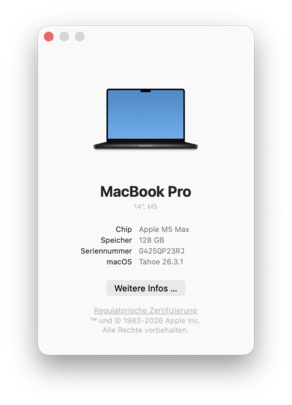 | Apple MacBook Pro 14 2026 M5 Max Apple M5 Max ⎘ Apple M5 Max 40-Core GPU ⎘ 128 GB Bellek, 8192 GB SSD | Liste fiyatı: 8589€ | 1.6 kg | 15.5 mm | 14.20" 3024x1964 254 PPI Mini-LED | |