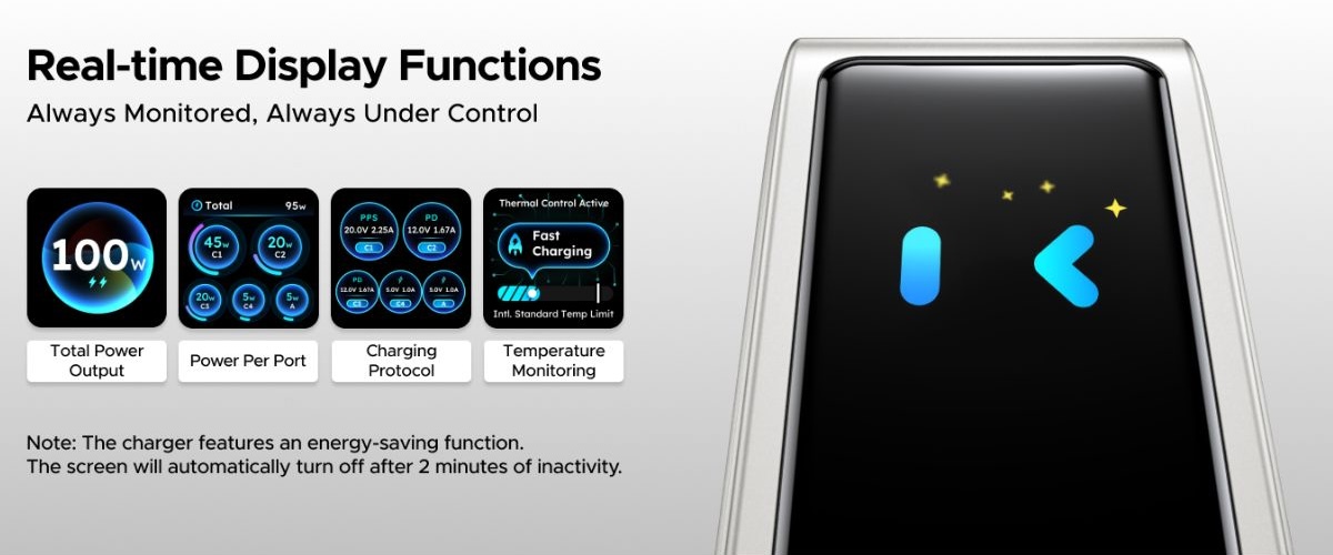 Nexode Pro 100W Şarj Cihazı PD 3.0, QC 4.0 ve PPS dahil olmak üzere bir dizi protokolü destekler. Kullanıcılar entegre ekranda güç dağılımı, şarj protokolleri ve sıcaklık gibi gerçek zamanlı şarj bilgilerini görüntüleyebilirler. Ayrıca, bu yeni Ugreen aksesuarı daha kompakt hale getirmek için katlanabilir bir tasarıma sahiptir.