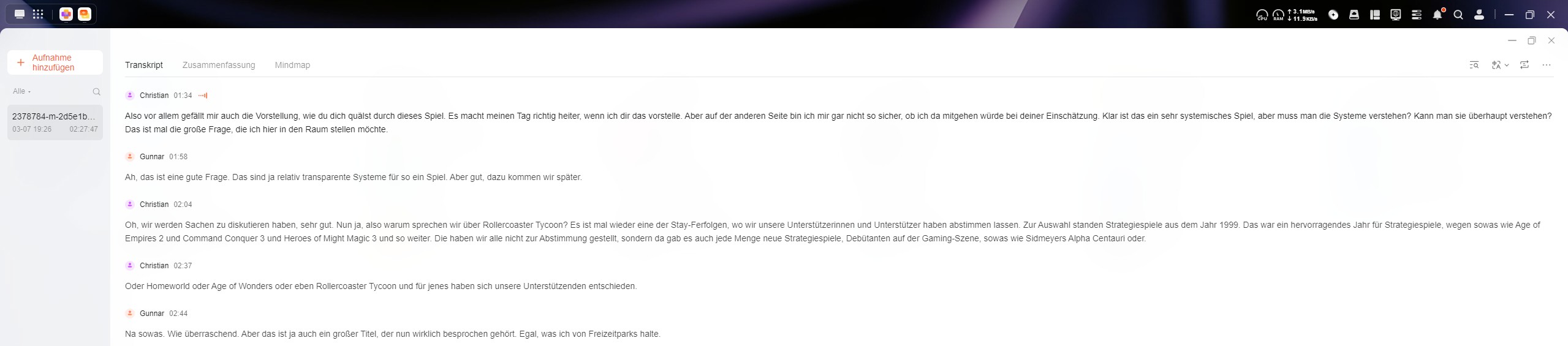 Bir uygulama yardımıyla ses dosyaları yazıya dökülebilir ve özetlenebilir. Bu işlevi bölüm 161'i kullanarak ayrıntılı olarak değerlendirdik sonsuza Kadar Kal podcast'inden. Podcast bölümü 2 saat 30 dakikanın biraz altında ve transkripsiyon 10 dakika sürdü. Transkript çok kullanışlı. Daha uzun monologlar bazen iki ayrı girişe bölünmüştür, ancak bu tamamen zararsızdır. Küçük sapmalar var; örneğin bir cümle doğru ifade yerine yanlış tanınmış. Konuşmacı tanıma güvenilir bir şekilde çalışıyor ve hem konuşmacı isimleri hem de transkriptin kendisi düzenlenebiliyor. İlgili metnin üzerine tıklandığında ilgili bölüm oynatılıyor. Genel olarak kullanıcı deneyimi çok iyi. Transkript biçimlendirilmiş bir DOCX belgesi olarak dışa aktarılabilir. Bir özet de oluşturulabilir ve hatta bir zihin haritası bile oluşturulabilir.