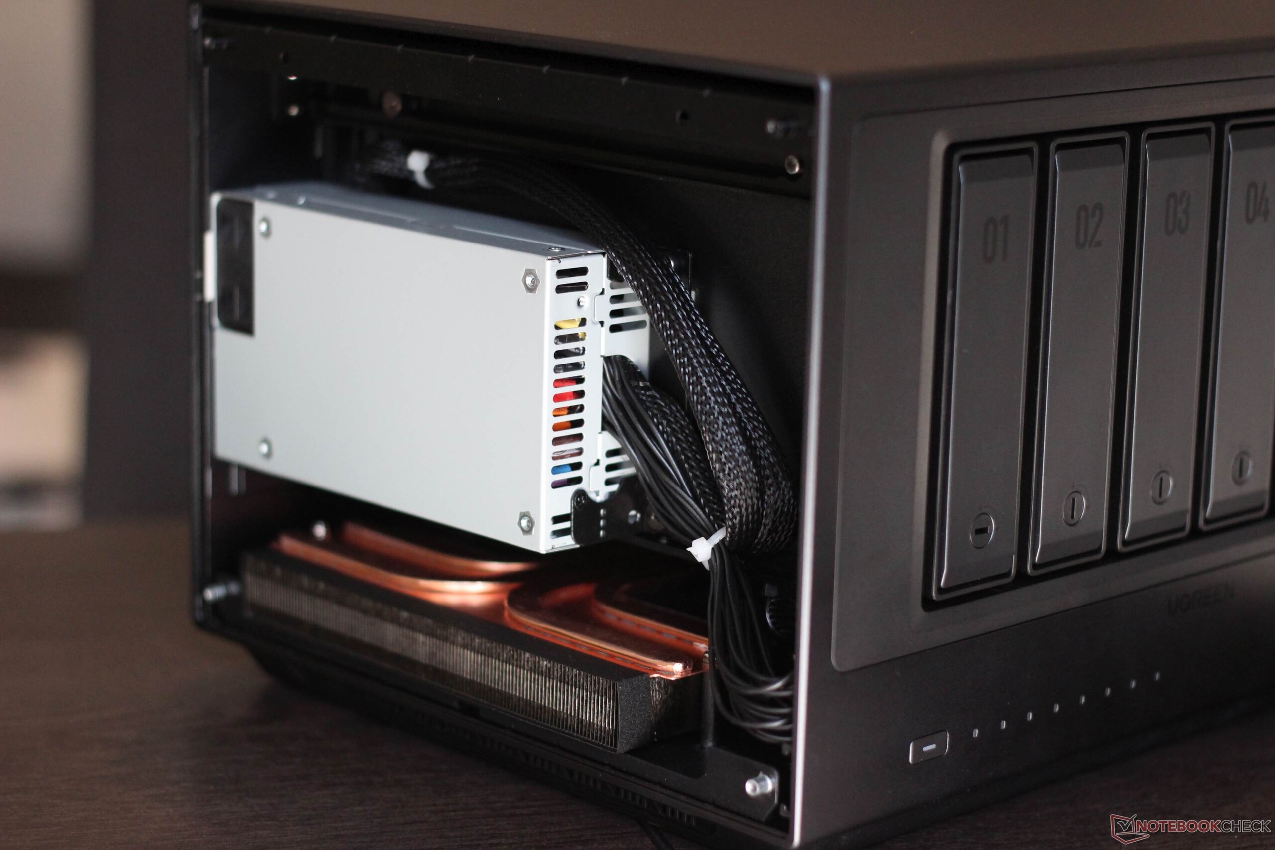 Her iki yan panel de çıkarılabilir. Sağ tarafta, iki M.2 SSD için yer vardır ve daha sonra bir PCIe kartı da eklenebilir. Bu bir NAS için pek de alışılmadık bir durum değil. Örneğin, ek bir ağ kartının takılmasına izin verir.