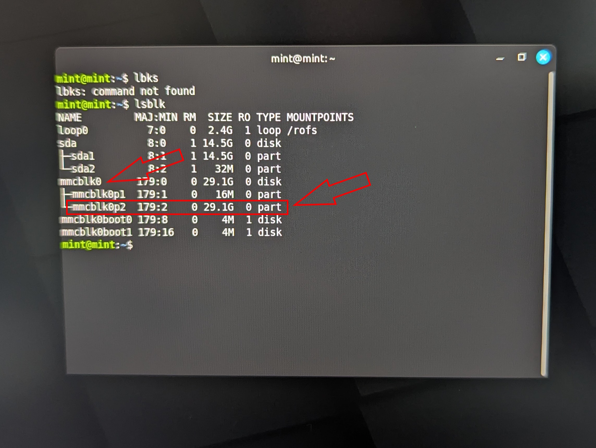 Bu komut tüm depolama aygıtlarını listeler. Dahili eMMC depolama alanı mmcblk olarak görünür. Diğer x86 sistemlerinde ad farklı olabilir. USB sürücüler genellikle sda, sdb, vb. olarak görünür.