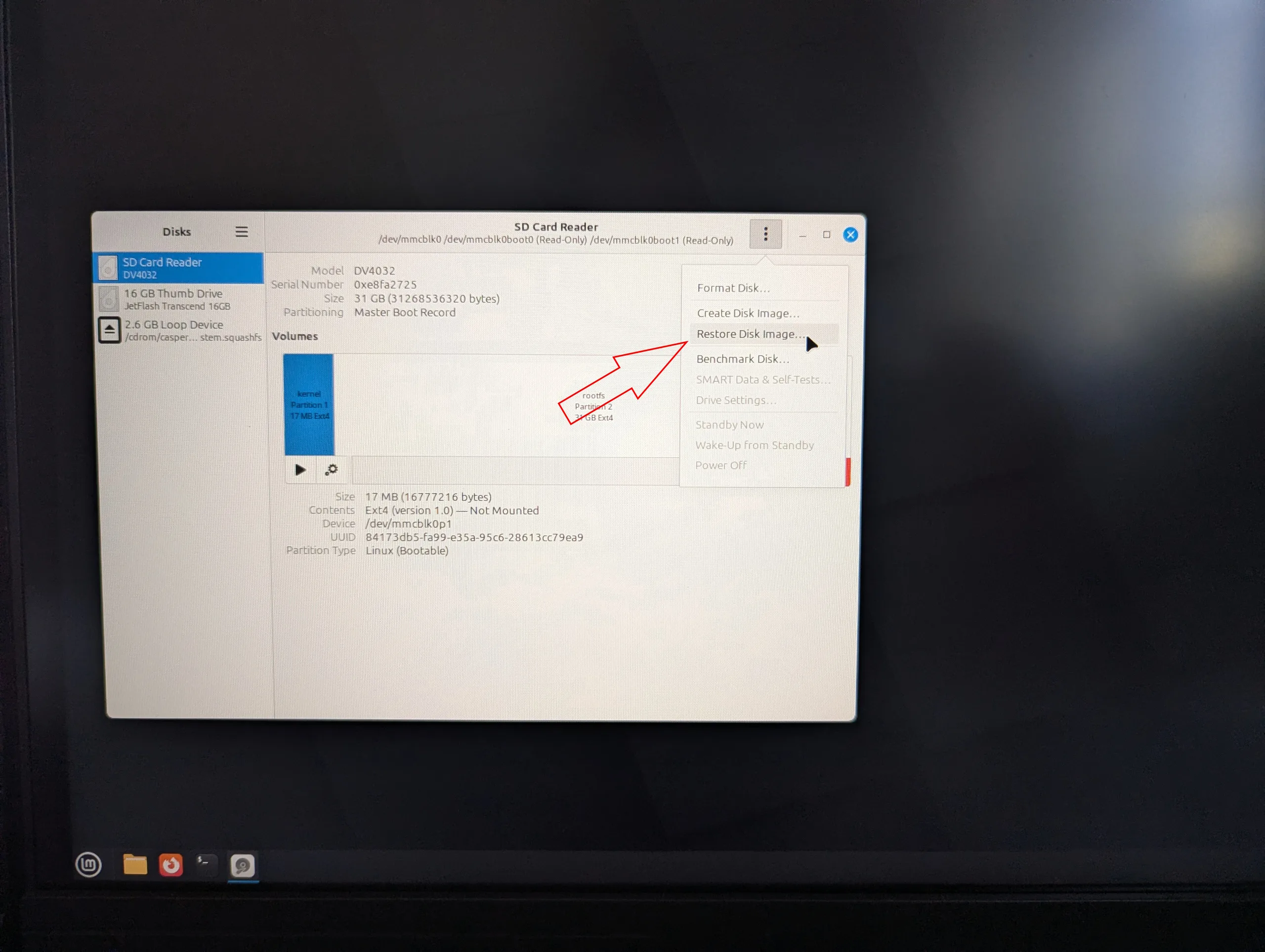 Diskler yardımcı programını açın (başlat menüsünde "Diskler "i arayın), dahili depolamayı seçin (benim Zimaboard'ımda "SD Kart" olarak görünüyor), menü düğmesine (3 nokta) tıklayın ve seçin: