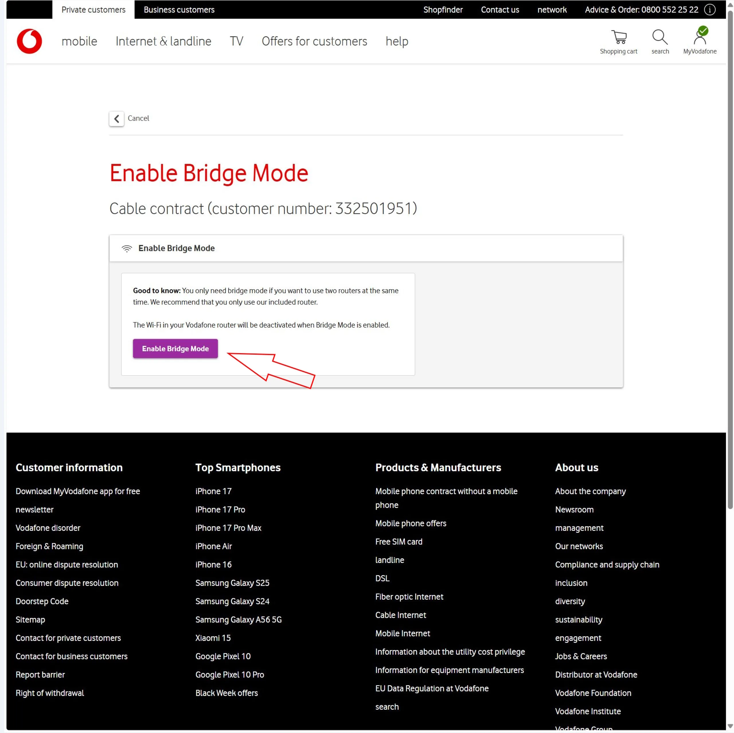Köprü modunu etkinleştirmek teknik olarak karmaşık değildir, ancak yönlendiricinin yerel web arayüzü üzerinden yapılmaz. Bunun yerine, Vodafone çevrimiçi hesabınıza giriş yapmanız gerekir.