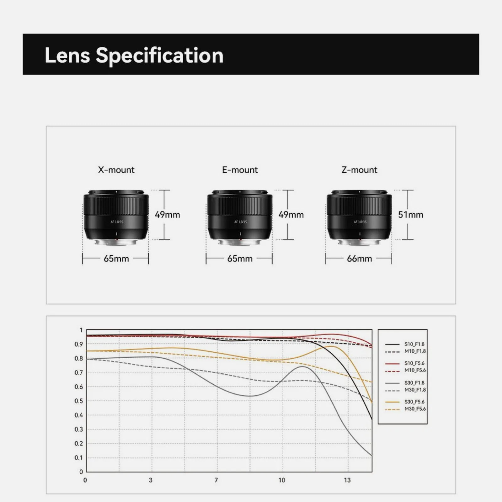 Lens, Sony E-mount ve Fujifilm X-mount kameralar için uygundur ve siyah ve gümüş varyantlar Nikon Z-mount ile de çalışır. Her durumda lens, tam kare sensörü tam olarak kapsamadığı için yalnızca APS-C sensörlü kameralar için uygundur