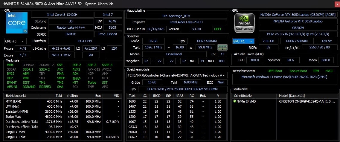 | Acer Nitro V 15 ANV15-52-50S2 Intel Core i5-13420H ⎘ NVIDIA GeForce RTX 5050 Laptop ⎘ 16 GB Bellek, 1024 GB SSD | Liste fiyatı: 1049 EUR | 2.1 kg | 23.5 mm | 15.60" 1920x1080 141 PPI IPS | |