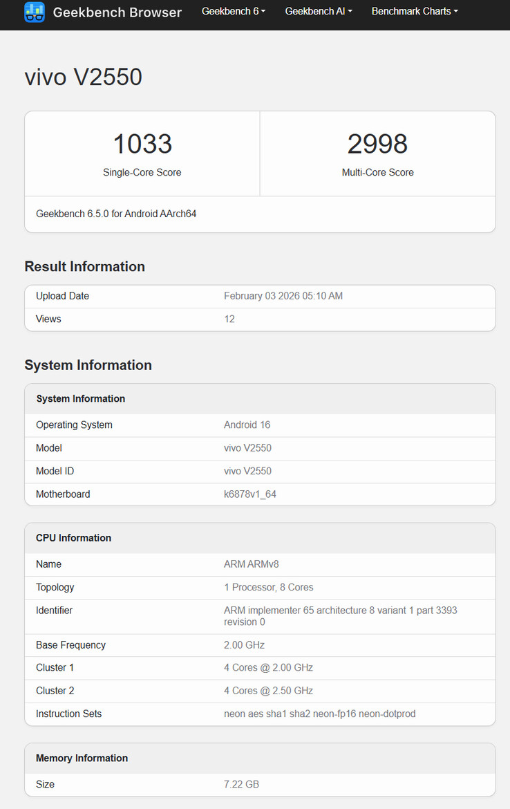 Aşağıdaki grafikten de anlaşılacağı üzere, söz konusu cihaz Vivo V70 FE'dir. Tıpkı Galaxy S25 FE (Amazon'da 449$) V70 FE'nin 'Fan Edition' statüsüne ulaşmak için kardeşlerinden daha yavaş bir yonga seti kullandığı söyleniyor. Özellikle, Vivo'nun V70 FE'yi MediaTek'in dört Cortex-A78 ve dört Cortex-A55 çekirdeği etrafında temel aldığı 4 nm'lik bir yonga seti olan Dimensity 7360 Turbo ile donattığı iddia ediliyor.