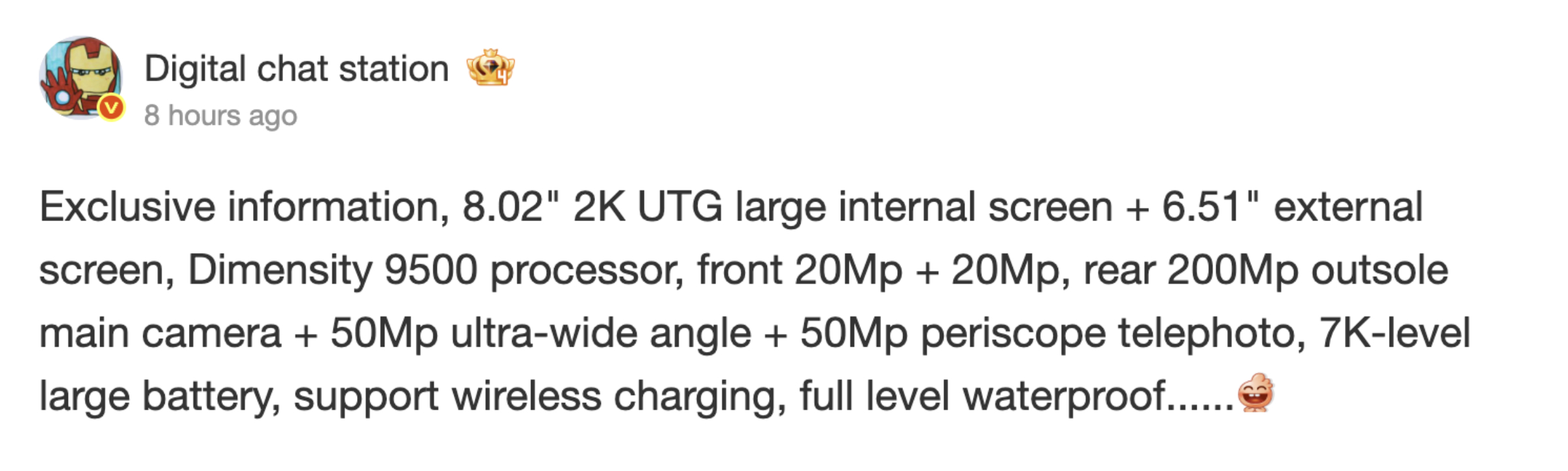 Dahası, X Fold6 kablosuz şarj desteğini ve Digital Chat Station'ın iddiasına göre 'üst düzey' su geçirmezlik özelliğini koruyacak. Görünüşe göre, Vivo da MediaTek'e geçecek ve Dimensity 9500 x Fold6 için yonga seti. 3 nm'lik bir yonga seti olan Dimensity 9500, halihazırda X9'u bulun, the X300 ve Pro muadilleri.