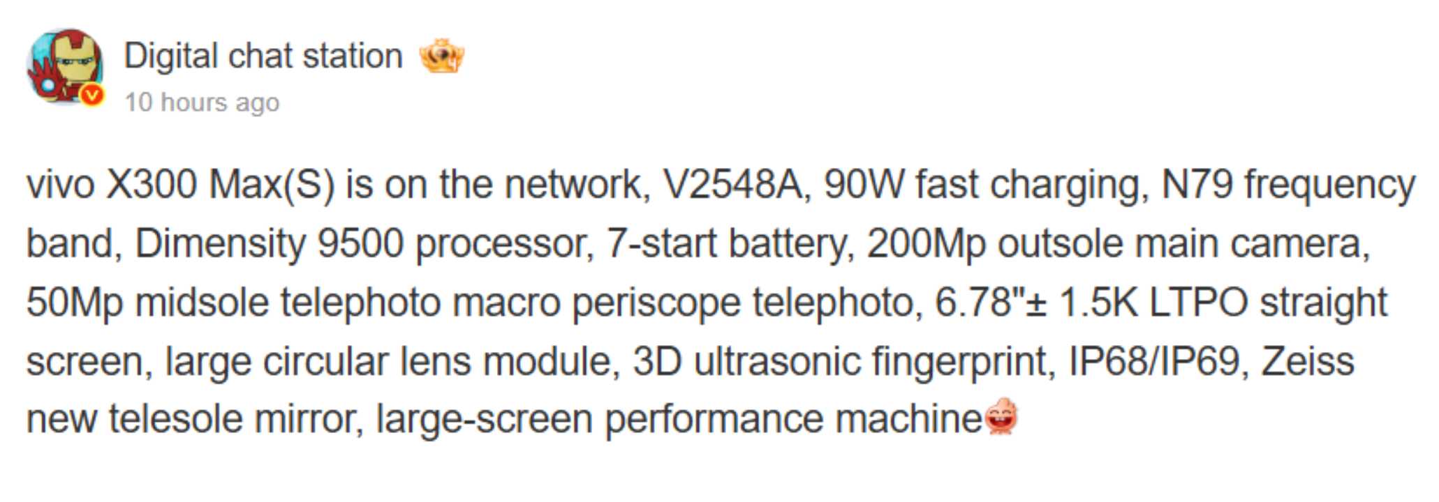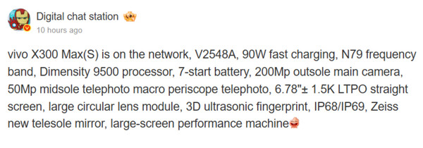 Şimdi ise Vivo, X300 Max'i Vivo'nun ana pazarında piyasaya sürülmeden önce Çin'de onayladı. V2548A model numarasını taşıyan X300 Max, X300'ün üzerinde yer almalı ve söylentilere göre X300e ancak X300 Pro ve X300 Ultra'nın altında. Digital Chat Station, ikinci bir X300 Max varyantının da olabileceğini gösteriyor; ancak bu modelle ilgili ayrıntılar şimdilik bilinmiyor.