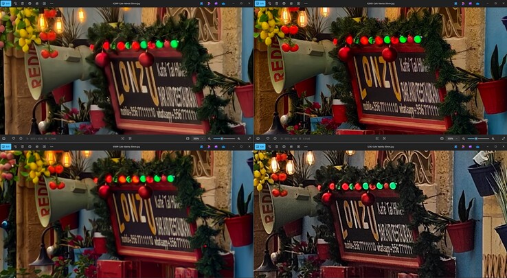 Daha yakından incelendiğinde, ayrıntılarda bazı farklılıklar ortaya çıkıyor. Vivo X200 Ultra'nın 35 mm'den 50 mm'ye dijital yakınlaştırması, Vivo modelleri arasında en zayıf olanı gibi görünüyor. Samsung'da metinler biraz daha okunaklı, ancak ışıklar aşırı beyaz görünüyor. Vivo X300 Pro'nun ana kamerası aşırı keskinleştirilmiş görünmeden en fazla ayrıntıyı korurken, X100 Pro karşılaştırıldığında 1 inçlik sensöründen çok fazla yararlanamıyor ve biraz fazla yumuşak görünüyor.