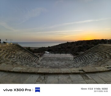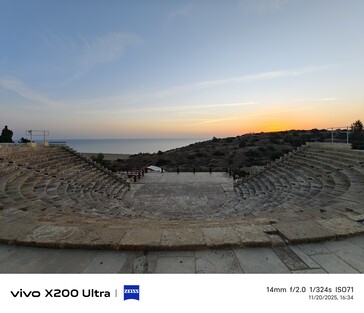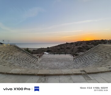 İkinci ultra geniş açılı örnek için 81 kilometre uzaktaki Curium'a (Kourion), çevrenin harika manzarasına sahip antik bir arkeolojik alana gidiyoruz. Kasım ayında burada genellikle pek bir şey olmaz, bu nedenle gün batımında amfi tiyatro gibi alanın bazı kısımları neredeyse ıssız hissedilebilir. Bu karşılaştırma, her resimde sağ alt köşede gösterilen ultra geniş açılı serideki 2023 model Samsung telefonu da içeriyor.
