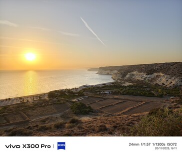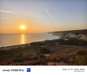 İkinci örnek için Kourion'a dönüyoruz, batan güneşe ve Kourion Plajına doğru bakıyoruz. Vivo X100 Pro'nun 1 inçlik sensörü gün batımının en renkli yorumunu sunuyor, ancak güneş o sırada tam olarak o kadar kırmızı olmadığı için en doğru olanı değil. En büyük sensöre ve en uzun deklanşör hızına sahip olmasına rağmen, bu fotoğraf aynı zamanda en karanlık olanı.