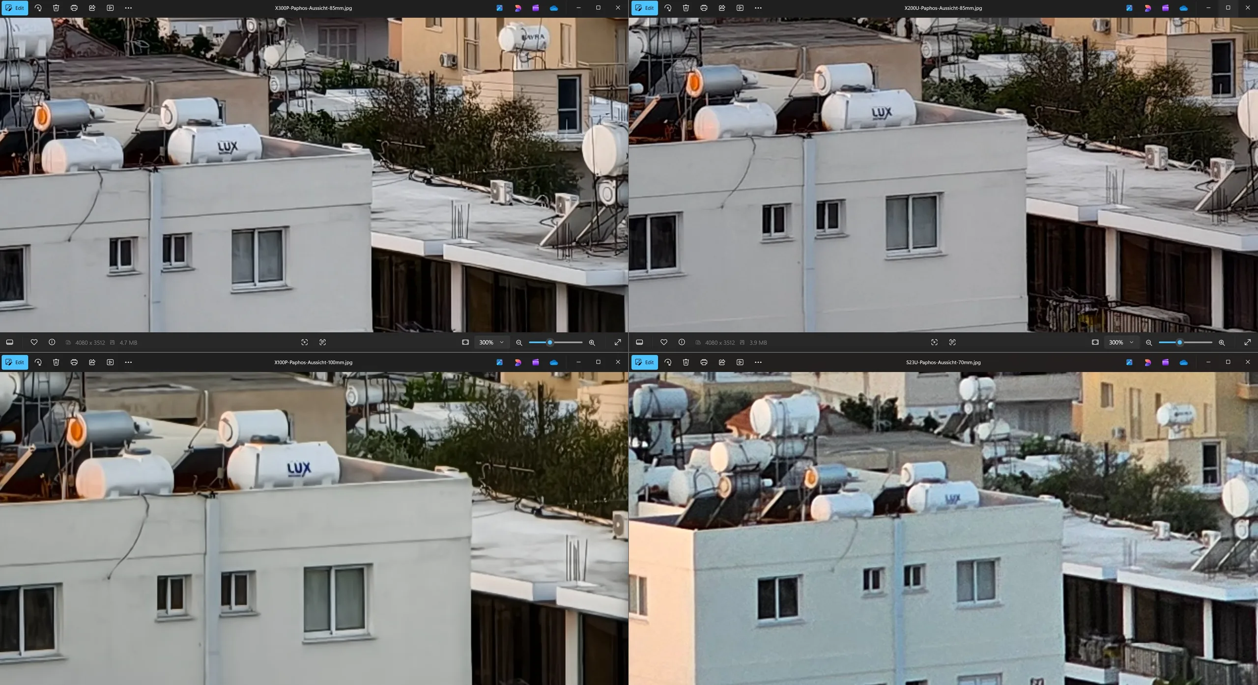 Her üç karşılaştırmada da, bir yanda Samsung Galaxy S23 Ultra ve Vivo X100 Pro ile diğer yanda Vivo X200 Ultra ve Vivo X300 Pro arasında keskinlik ve ayrıntı düzeyi açısından açık bir fark var. Son ikisi genellikle çok benzer bir seviyede ve esas olarak biraz daha güçlü renkler veya daha yeni Pro modelinde biraz daha fazla kontrast gibi daha ince ayrıntılarda farklılık gösteriyor.