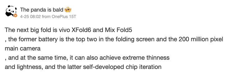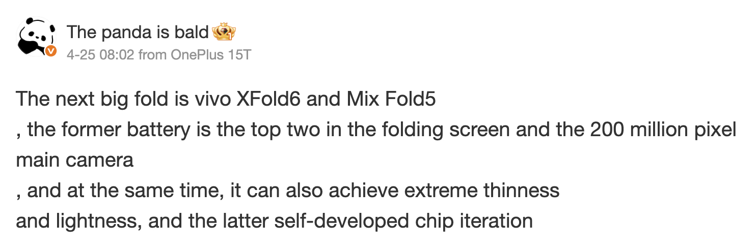Daha önce, Akıllı Pikachu iddiası vivo'nun bir sonraki kitap tarzı katlanabilir cihazının X Fold6 olarak piyasaya sürüleceğini duyurdu. Şimdi de Bald Panda, cihazın nihai adı olduğuna inandıkları X Fold6 söylentilerine ağırlık verdi. Weibo'da yazan popüler hesap, X Fold6'nın aşağıdaki modellere katılacağını yineliyor N6'yı bulun 200 MP birincil kameraya sahiptir.