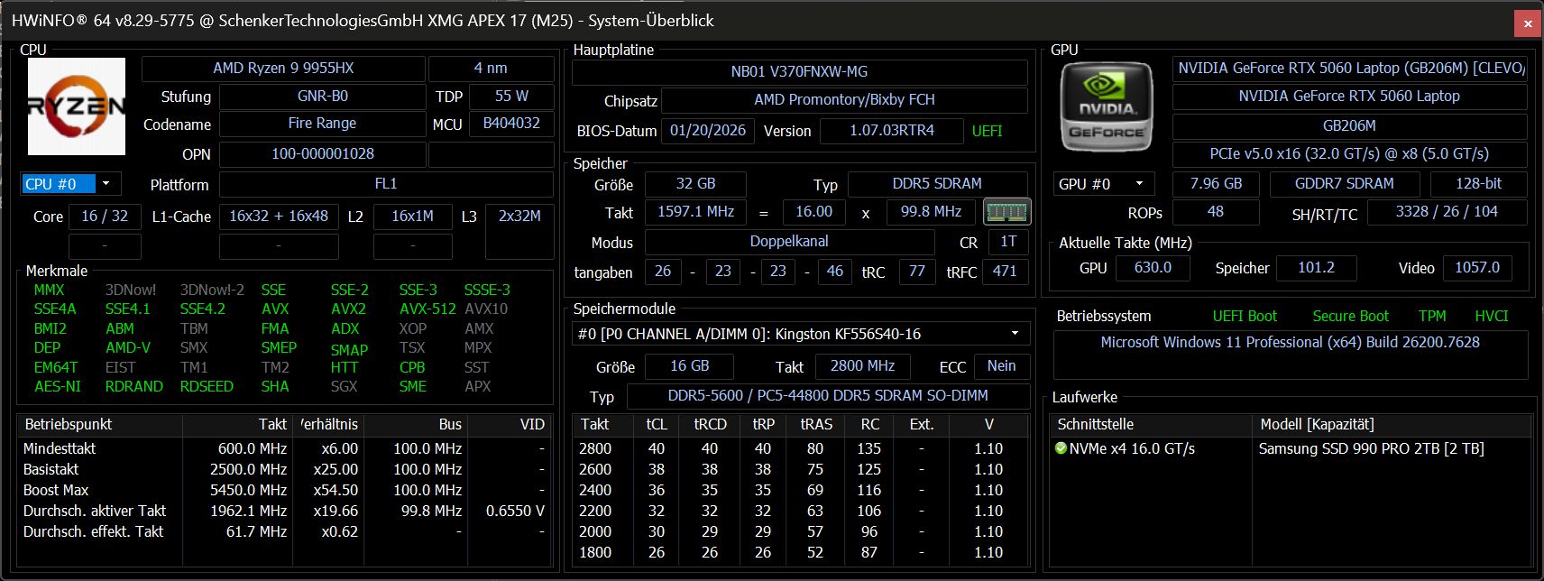 | Schenker XMG Apex 17 M25 AMD Ryzen 9 9955HX ⎘ NVIDIA GeForce RTX 5060 Laptop ⎘ 32 GB Bellek, 2048 GB SSD | Liste fiyatı: 1899 Euro | 2.8 kg | 28.6 mm | 17.30" 2560x1440 170 PPI IPS | |