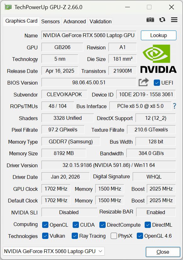 | Schenker XMG Apex 17 M25 R9 9955HX, GeForce RTX 5060 Laptop | Lenovo Legion 7 16IAX10 Ultra 7 255HX, GeForce RTX 5060 Laptop | HP Omen 16-ap0091ng R9 8940HX, GeForce RTX 5060 Laptop | MSI Cyborg 17 B13WFKG i7-13620H, GeForce RTX 5060 Laptop | Tulpar T6 V3.5 i7-14700HX, GeForce RTX 5060 Laptop | |