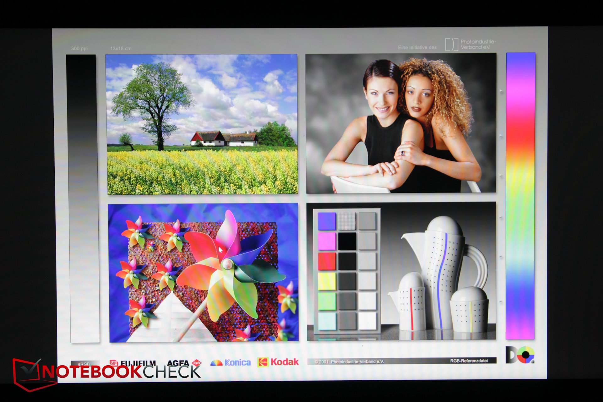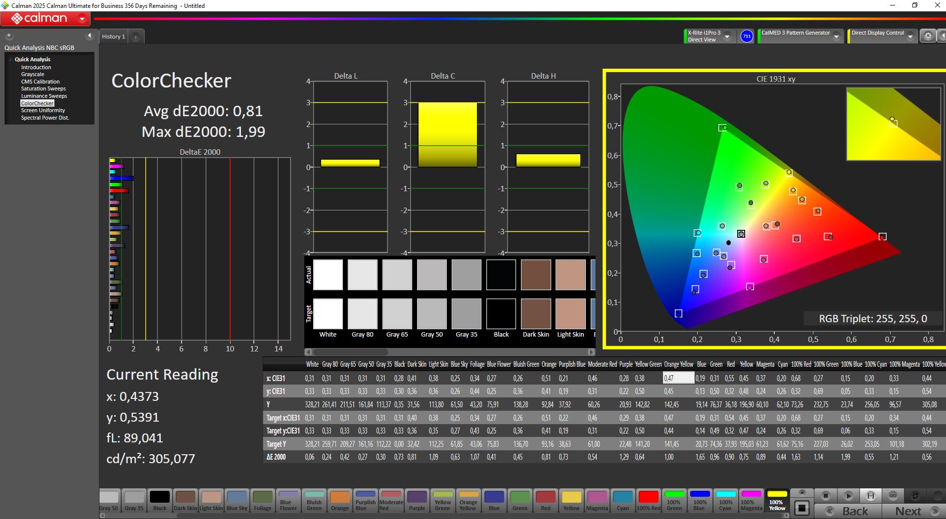 Kutudan çıktığında kalibrasyon zayıftı ve yüksek DeltaE sapmaları vardı. Manuel yeniden kalibrasyondan sonra, gri tonlama ve renk sapmalarını 1'in altına düşürdük - mükemmel sonuçlar. Kalibre edilmiş ICC profilimiz yukarıda indirilebilir.