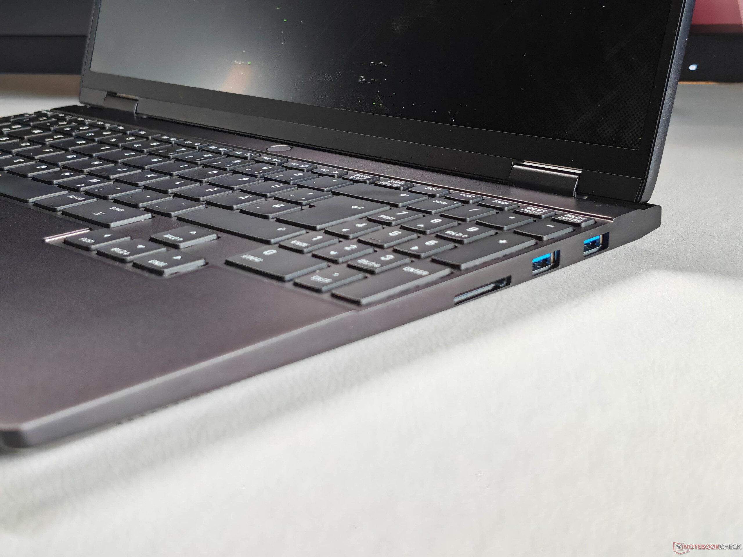 Klavye, kasanın tüm genişliğini kaplıyor ve büyük ok tuşlarının yanı sıra özel bir sayı tuş takımı içeriyor. Genel olarak yazma konforu çok iyi ve uzun metinler sorunsuzca yazılabiliyor; sadece büyük tuşlar biraz daha yüksek ses çıkarıyor. Beyaz arka aydınlatma dört parlaklık seviyesi sunuyor.